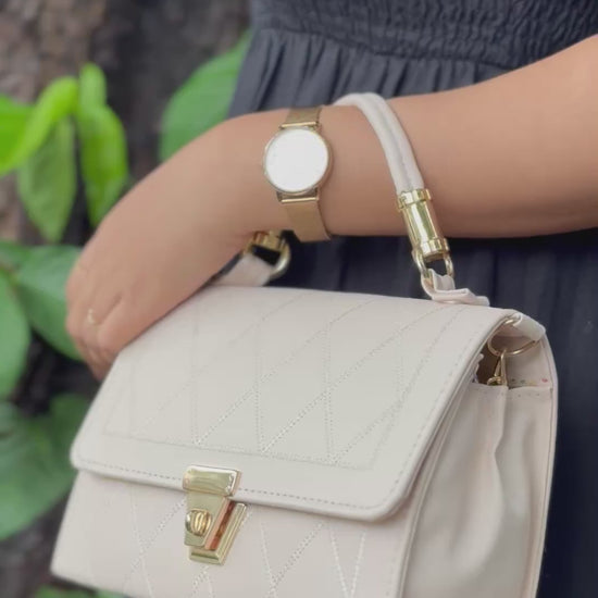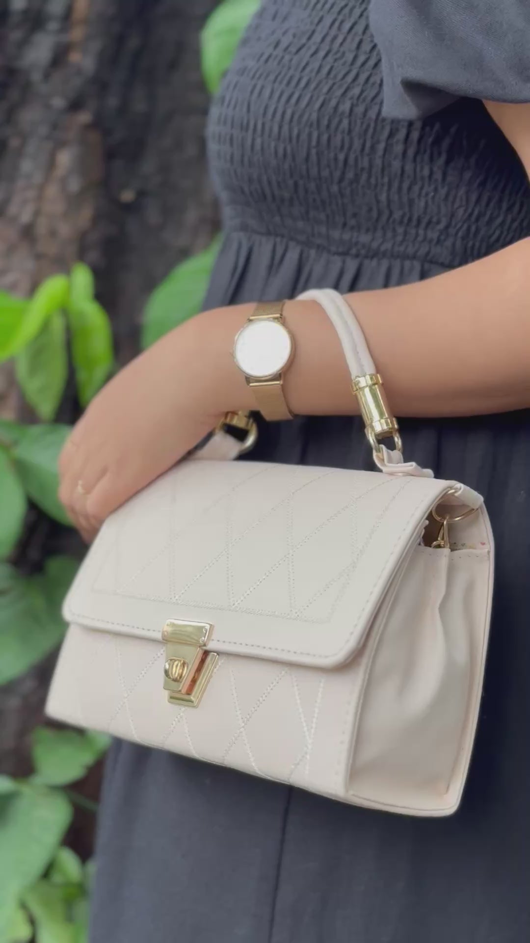 This stylish handbag is crafted from a high-quality white quilted material, giving it a classic and sophisticated look. It features a sleek top handle and a detachable shoulder strap that combines both a gold and a matching beige strap for versatility. The polished gold hardware, including the secure turn-lock clasp, adds a touch of luxury. Perfect for a night out or a formal event, this bag offers both elegance and function.
