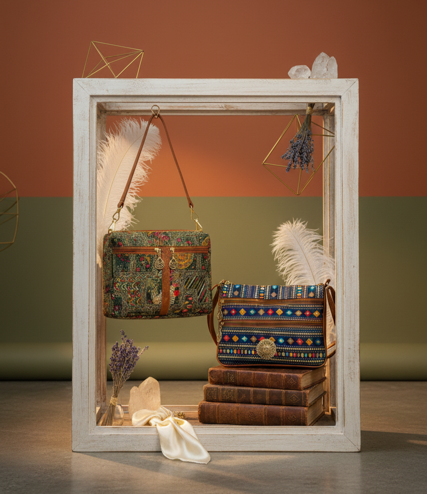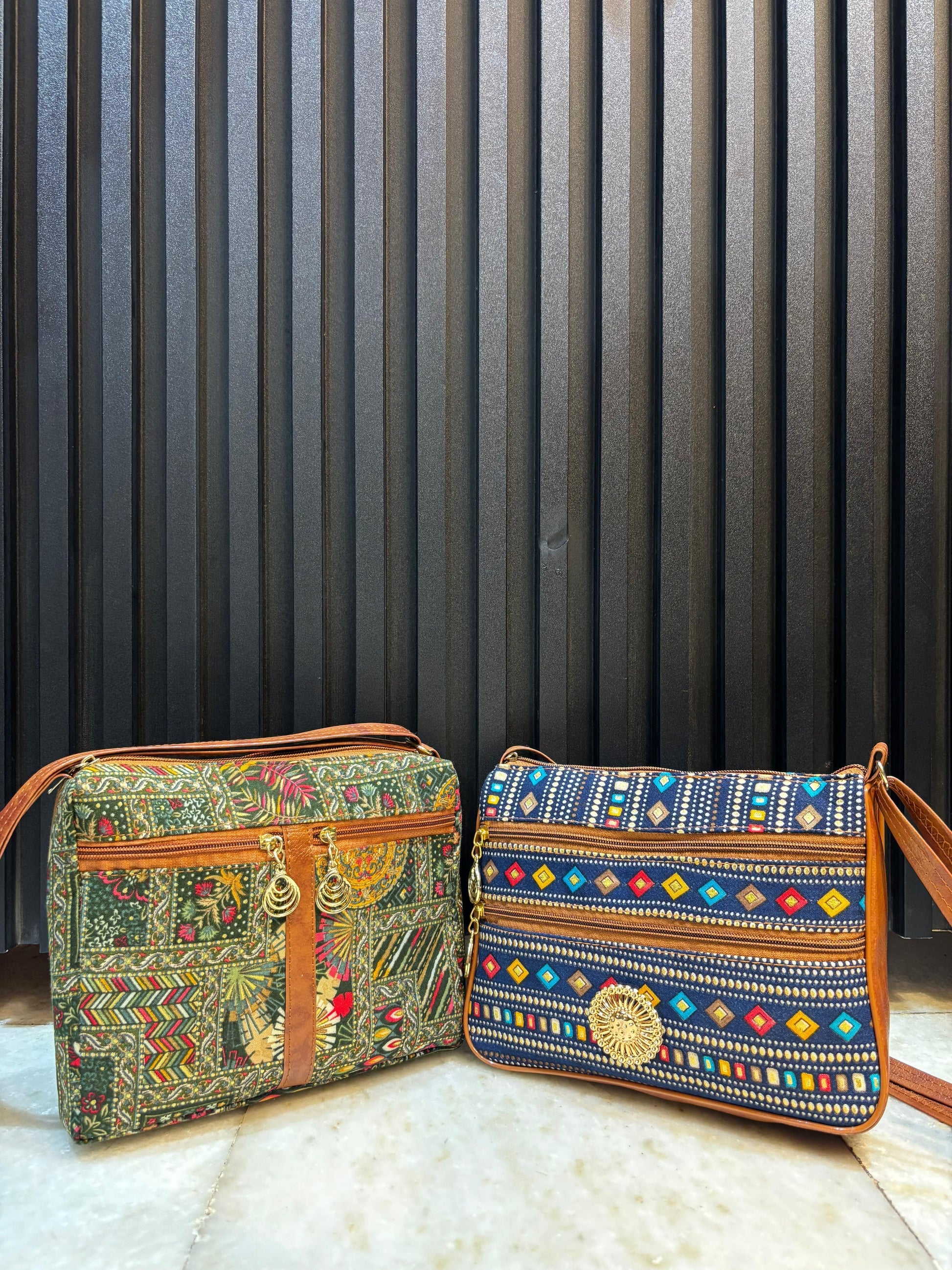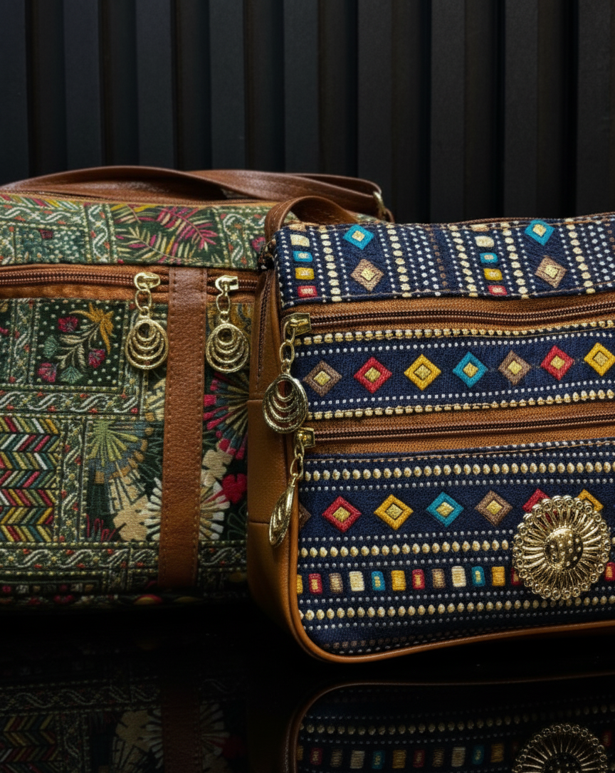 Step into the world of vibrant traditions with a modern twist! Our Boho Bloom Dual-Tone Sling Bags are a must-have for every fashion-forward woman. With beautiful ethnic embroidery, eye-catching mirror work, and golden metal charm detailing, these bags blend style and utility effortlessly.