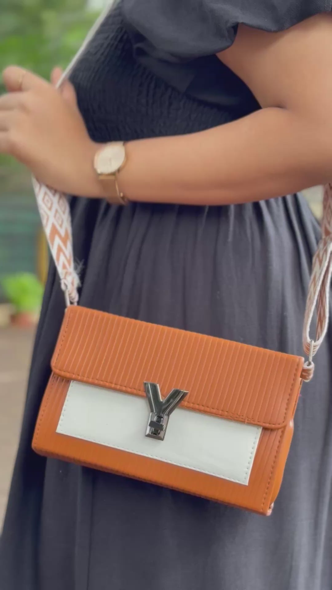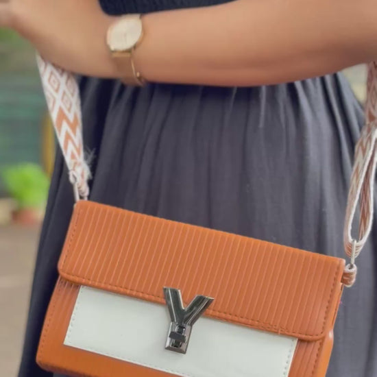 Elevate your everyday fashion with the Monochrome Luxe Flap Bag — a perfect blend of elegance and edge. Featuring a ribbedbody with a contrasting front flap, this trendy sling bag is designed to turn heads. The bold “Y” metallic logo and wide chevron strap add a statement touch, while the spacious interior easily holds your phone, wallet, keys, and more