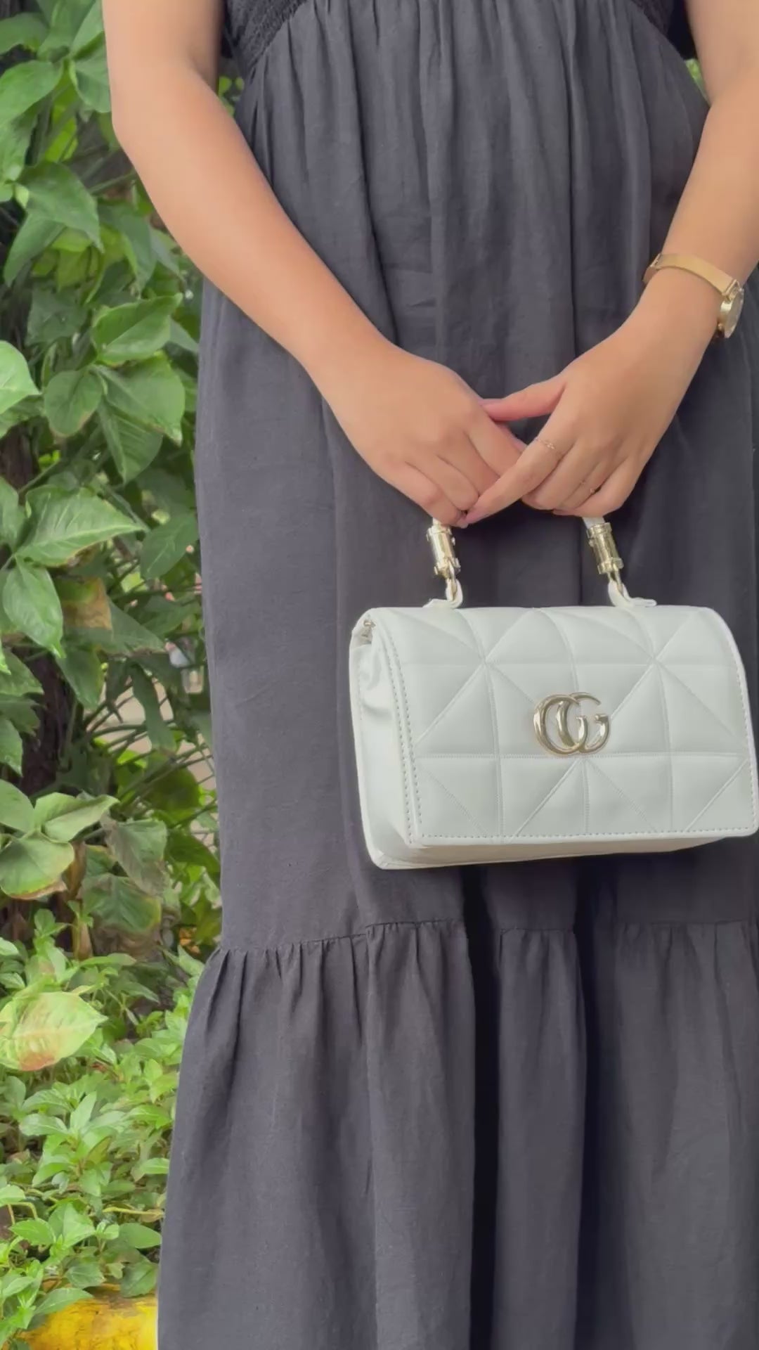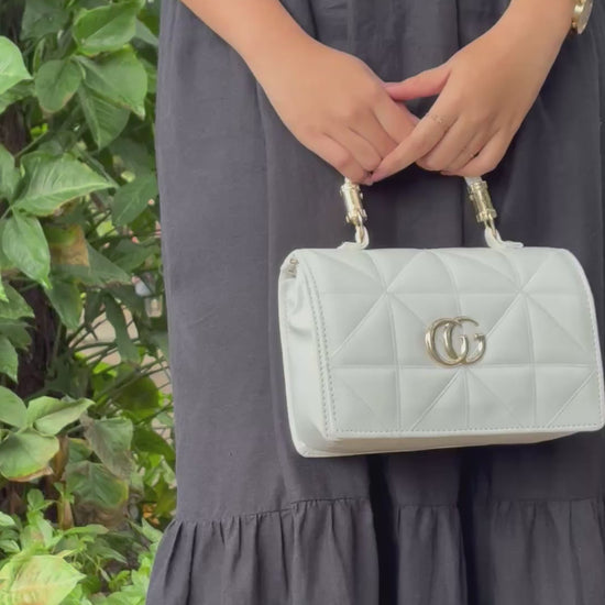Add a touch of luxury to your style with this elegant white quilted handbag. Designed with a sleek structured silhouette, it features a premium gold-tone "CG" emblem on the front flap, enhancing its chic appeal. The bag comes with a sturdy leather top handle and a stylish chunky chain strap for versatile carrying options. Perfect for both formal and casual occasions, this handbag combines sophistication and functionality, making it a must-have accessory in your wardrobe.